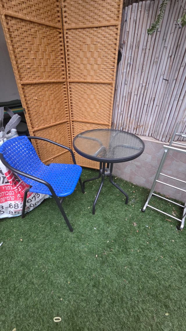 Стеклянный столик и два синих , пластиковых стула .